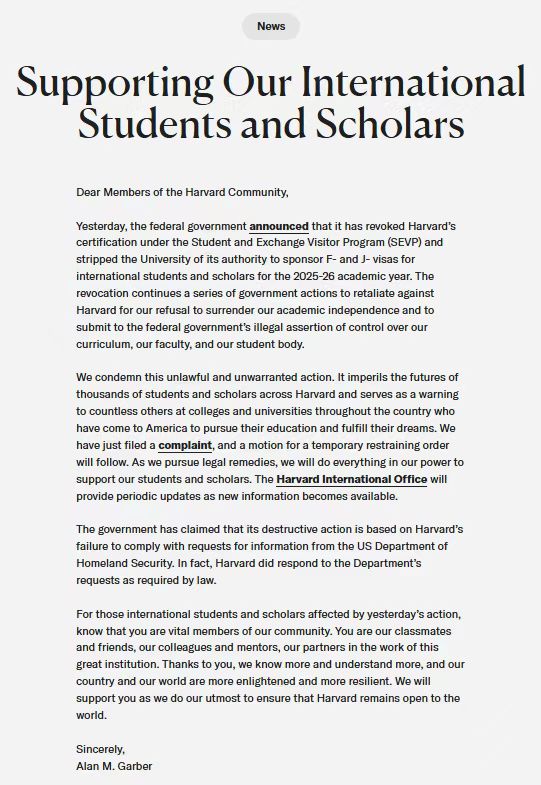 本月22日,美國國土安全部宣布取消哈佛大學(xué)獲得的學(xué)生和交流學(xué)者項(xiàng)目資質(zhì),禁止該校招收國際學(xué)生。23日,哈佛大學(xué)就這一政策起訴特朗普政府。校長加伯當(dāng)天在致哈佛社區(qū)成員的一封信中寫道:“我們譴責(zé)(‘禁招令’)這一非法且不當(dāng)?shù)男袨?。這一行為危及哈佛大學(xué)數(shù)千名學(xué)生和學(xué)者的未來,也給全美各地高校眾多赴美求學(xué)、追求夢想的學(xué)子敲響了警鐘?!?/p>